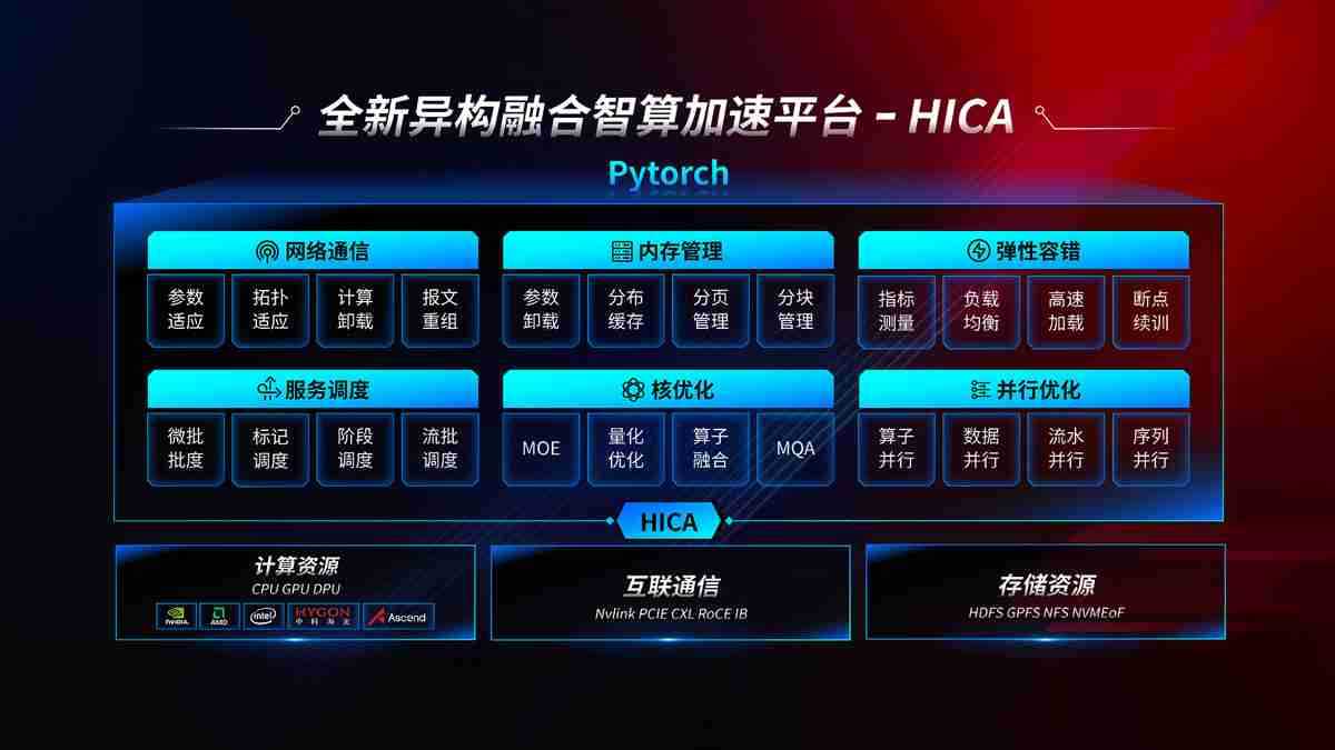 通过自研的服务层、、、、中间适配层、、、、以及调度编排算法,,采用数据并行、、、模型并行等多种并行方式,,把并行计算任务进行有效的分解,,,使其分别由相应的软件栈和算力资源来承接。。当GPU资源变化,,HICA可以实时动态调度计算子任务并调整模型拓扑和架构,,,以充分聚合各种算力资源。。。