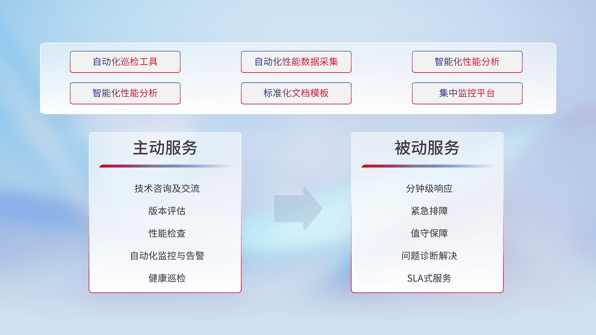 智能化工具和标准化文档,,,,保障服务质量,,,,提供主动服务(包含技术咨询、、、、版本评估、、、性能检查、、、、自动化监控与告警、、、健康巡检)和被动服务包含(分钟级响应、、、紧急排障、、值守保障、、、、问题诊断解决、、SLA服务)。。。